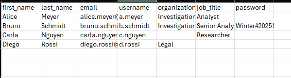 Administratoren können mehrere Benutzerkonten gleichzeitig mithilfe einer CSV-Datei erstellen. Dieser Workflow vereinfacht das Onboarding für Teams, Abteilungen und ganze Organisationen. Passwörter können in der CSV-Datei enthalten sein oder leer gelassen werden. Wenn das Passwortfeld leer ist, kann der Nutzer entweder beim ersten Login die Passwort vergessen Funktion nutzen oder ein Administrator muss nachträglich ein Passwort erstellen und dem Nutzer außerhalb der Anwendung mitteilen.