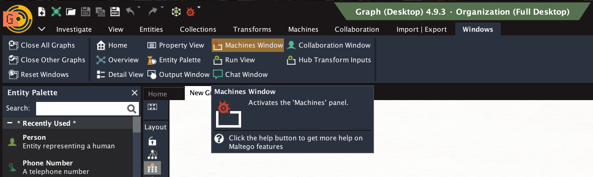 The Machine window provides status information about a machine that is currently running. The features of this window are described in the machines section.