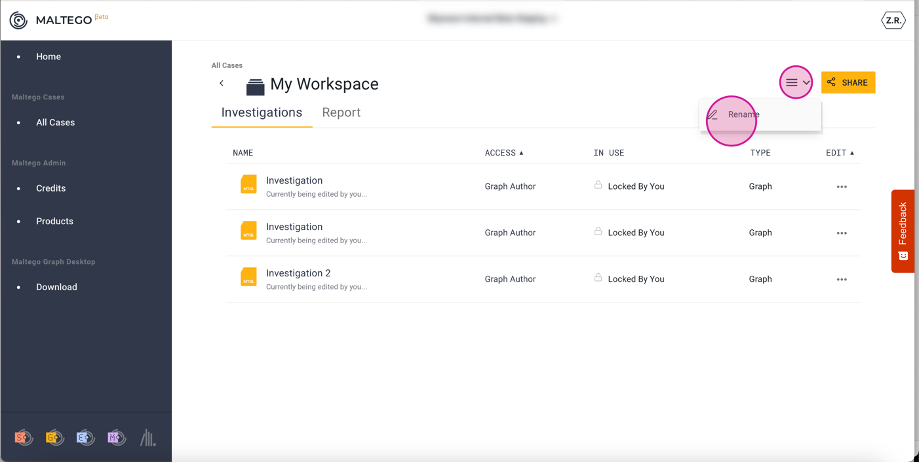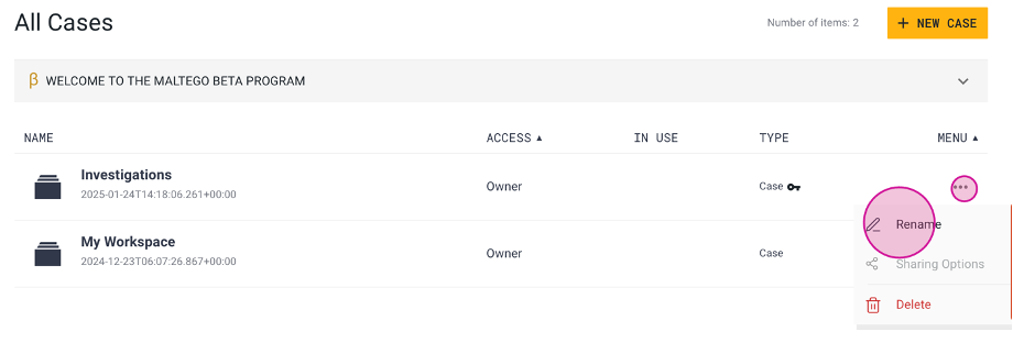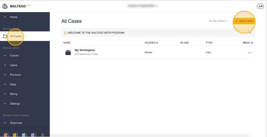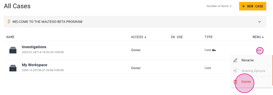 To create a case, log in to the Maltego app and navigate to All Cases from the side menu. Here, you will see all the cases you have created, as well as those shared with you. To create a new case, click the New Case button in the top-right corner.