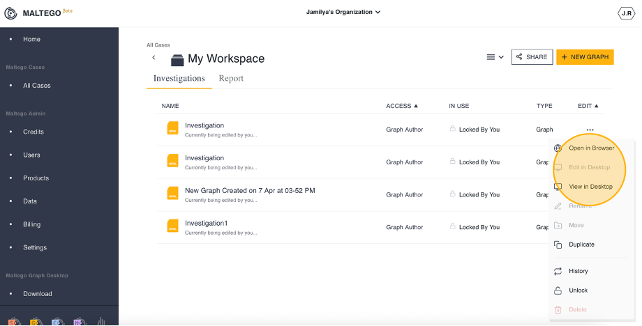 Users can open an existing graph using either Maltego Graph (Desktop) or Maltego Graph (Browser). Follow these steps to do so: