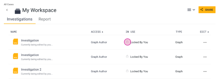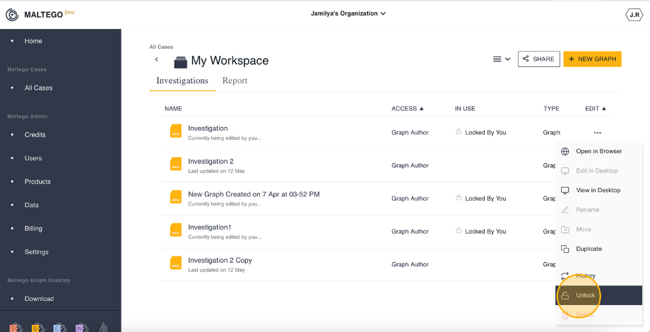 Graphs are locked by default when they are opened in Maltego Graph (Browser) or Maltego Graph (Desktop) to prevent contributors from making changes indicated by the lock icon.