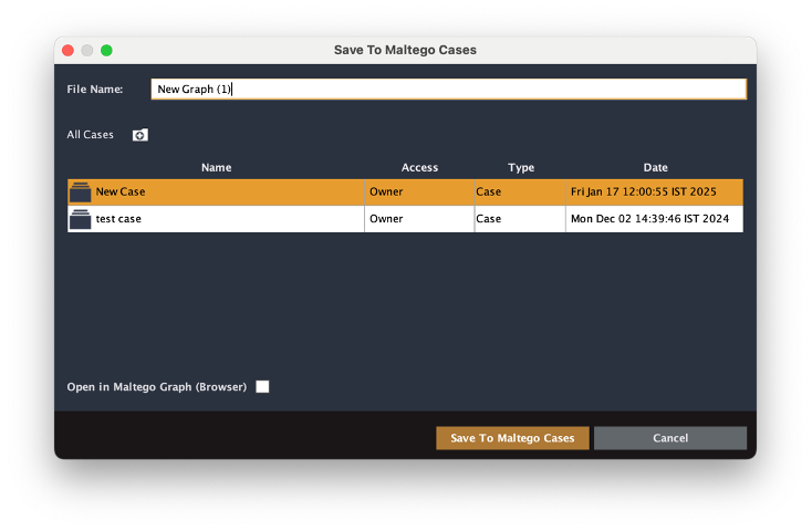 Maltego Graph (Desktop) is integrated with Maltego Cases allowing you to save graphs from Desktop to your case folders.