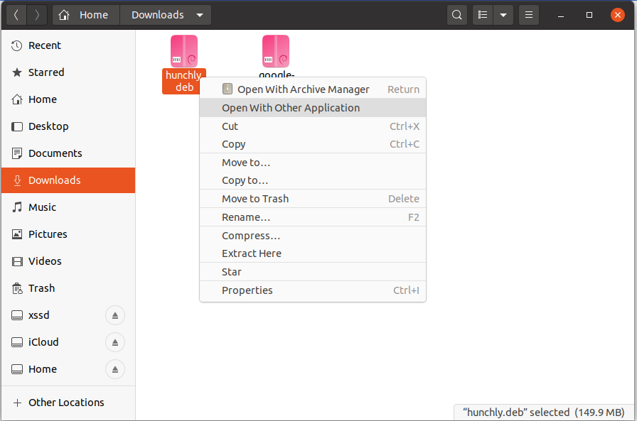 4. Right-click on the downloaded "hunchly.deb" installer and click on "Open with Other Application"