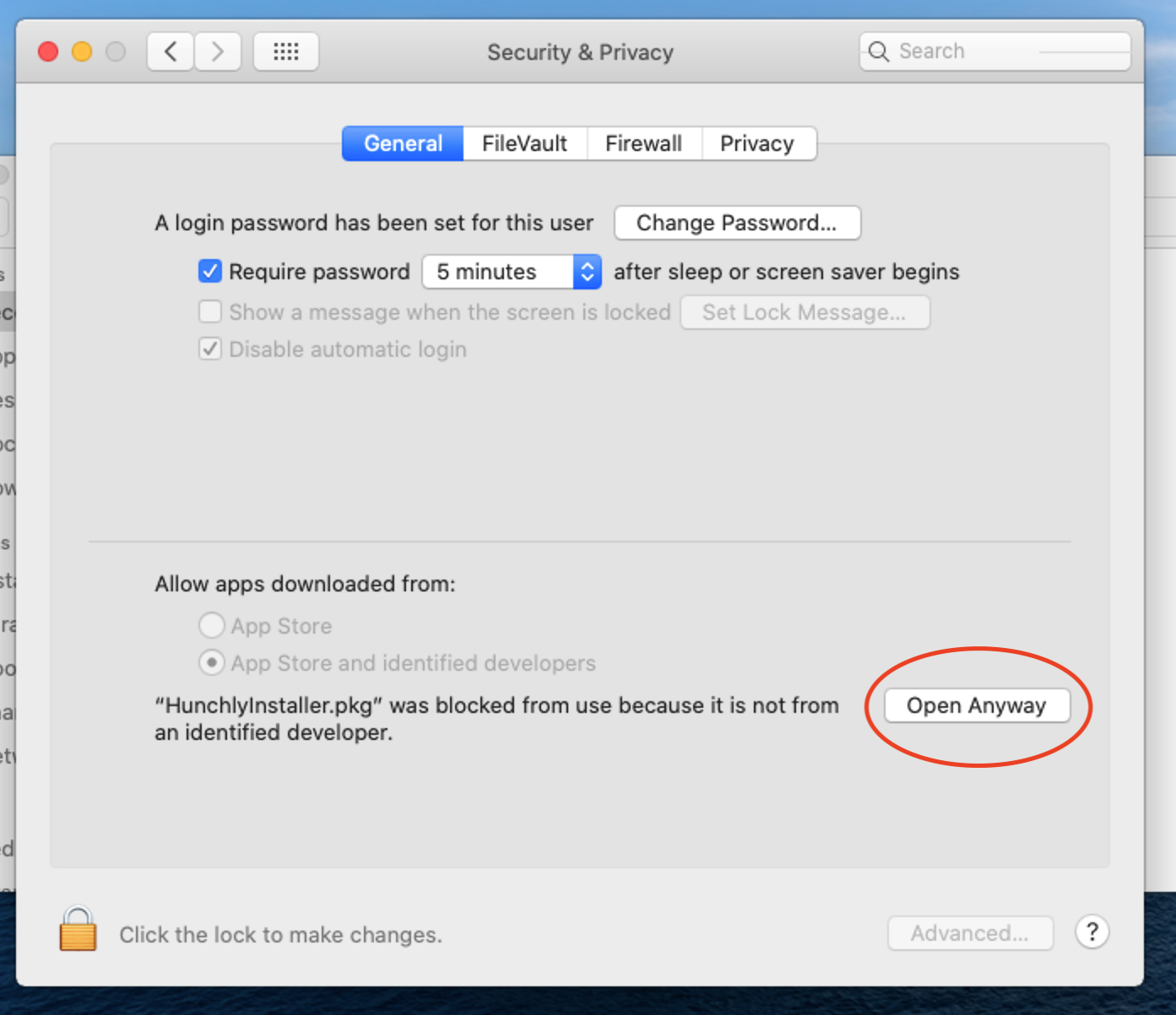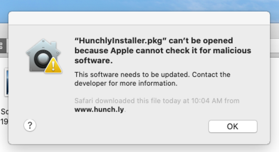 - A message will be shown stating that "HunchlyInstaller.pkg was blocked from use because it is not from a verified developer". Click "Open Anyway"