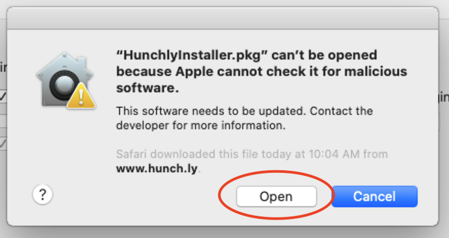 - Open the downloaded "HunchlyInstaller.pkg" file again. Another warning will appear - click "Open"