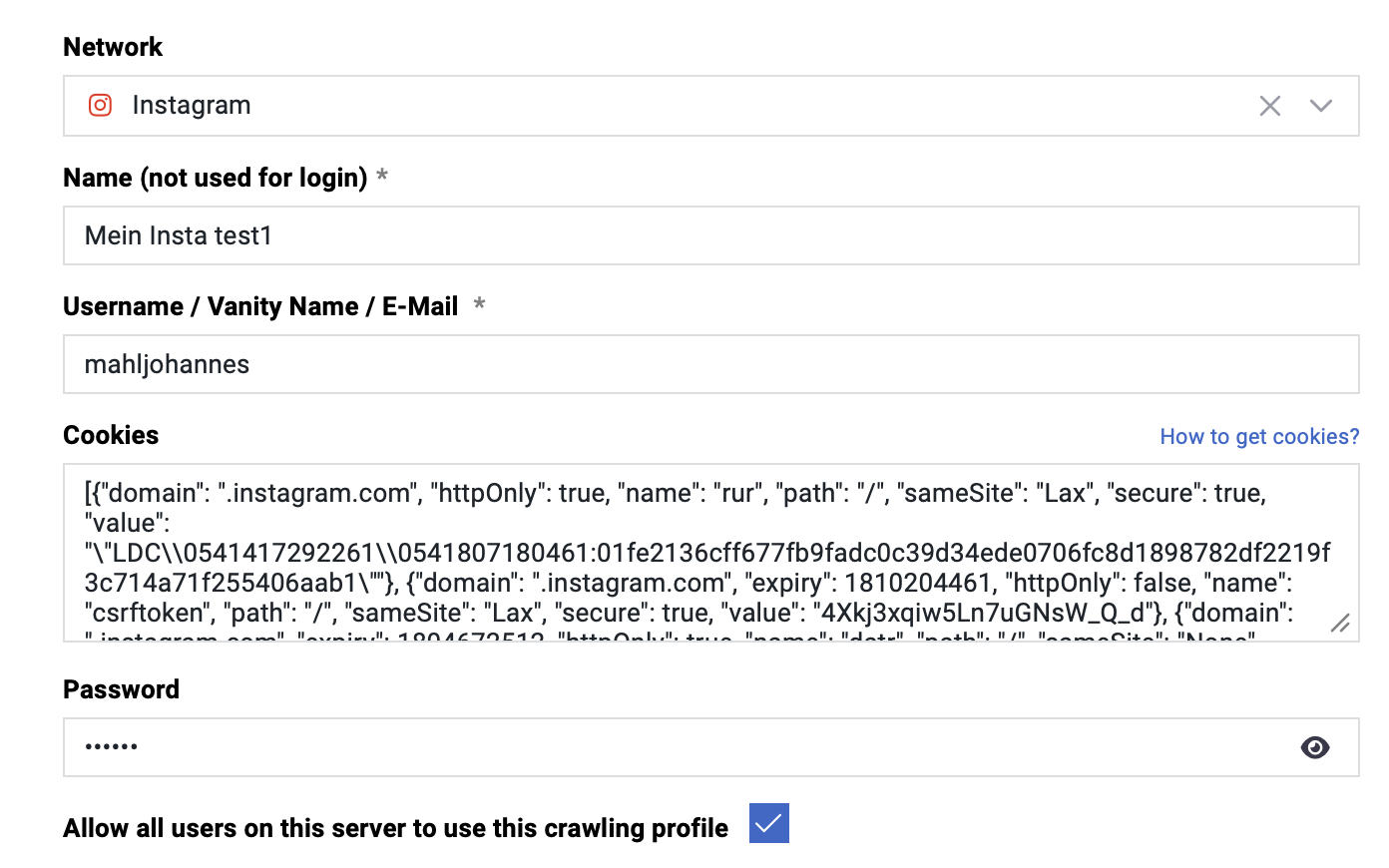 For all other networks, the Cookies field is not displayed, as these modules do not currently support manual cookie insertion.
