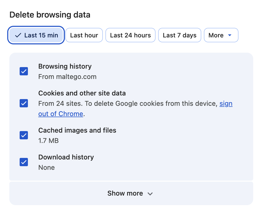 - Optionally delete browser data from the last 15 minutes (or the last hour if needed). In Chrome, head to Settings -> Privacy and Security -> Delete Browsing Data.